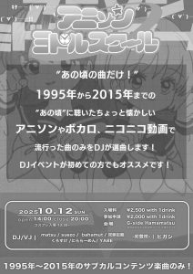 10月12日日曜日 アニソンミドルスクール アニソンミドルスクール open 14:00 / close 20:00 / コスプレ入場 13:30 入場料 ¥2500 with 1D / 参加申請 ¥2000 with 1D -DJ / VJ- matsu suezo bahamut 双頭巨龍 くろすけ にららーめん YABE -初登校- ヒガシ